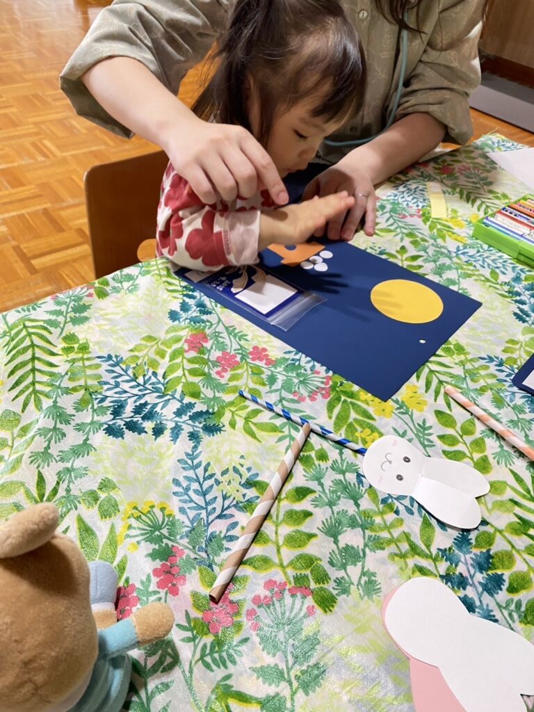 *前回は涼しいホールでボールプール・SL4輪車・ままごと等々で楽しみ、工作コーナーでは、お月見うさぎの紙とんぼ」をつくって遊びました♪